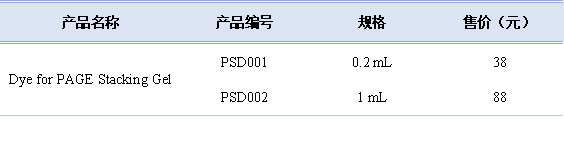 PAGE 濃縮膠染料(Dye for PAGE Stacking Gel, 1000×)是一種用于配制聚丙烯酰胺凝膠濃縮膠(上層 膠、積成膠)的染料,該染料有紅、橙、黃、藍(lán)、綠、 藍(lán)5種顏色可供選擇。添加該染料可以使得濃縮膠蛋白點(diǎn)樣孔一目了然,方便將蛋白樣品準(zhǔn)確無誤加入點(diǎn)樣孔中,易于判斷上樣孔邊距或是否歪曲破損。并且該染料的顏色不會(huì)隨著電泳而進(jìn)入分離膠(下層膠),可穩(wěn)定的存在于濃縮膠中,電泳完成后也便于識(shí)別上層膠并切除,不會(huì)影響電泳和染色效果。