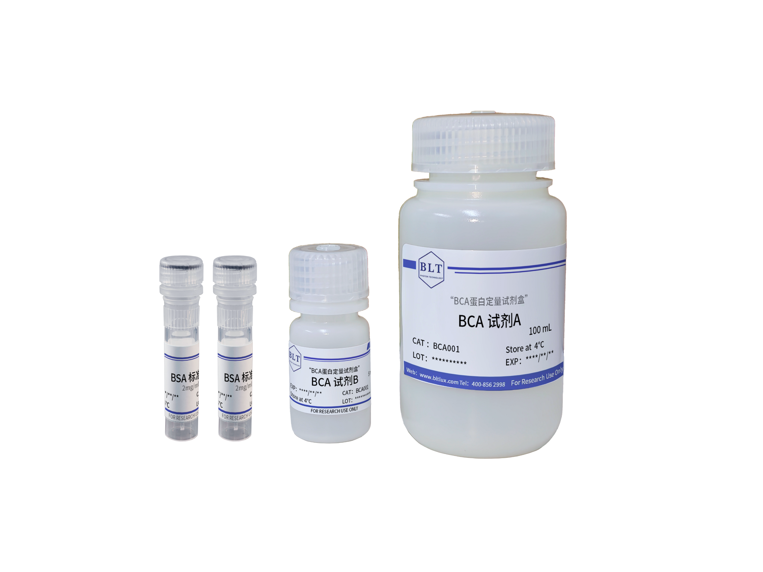 BCA (Bicinchoninic acid) 法是目前應(yīng)用比較廣泛的蛋白質(zhì)濃度測定方法。基于雙縮脲反應(yīng),即在堿性環(huán)境下蛋白質(zhì)將Cu2+還原成Cu+,Cu+與BCA試劑形成紫顏色的絡(luò)合物,在562 nm處有高的吸光值,該反應(yīng)產(chǎn)物的量與蛋白質(zhì)濃度成正比。測定其在562 nm處的吸光值,并與標(biāo)準(zhǔn)曲線對比,即可計(jì)算待測蛋白的濃度。該方法快速靈敏、穩(wěn)定可靠且對不同種類蛋白質(zhì)變異系數(shù)很小。試劑盒中提供了濃度穩(wěn)定的蛋白標(biāo)準(zhǔn)品用于制作標(biāo)準(zhǔn)曲線。