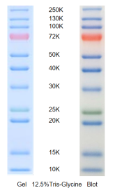 三色預(yù)染蛋白 Marker(10-250KD)包含了 11 種高度純化并預(yù)染的重組蛋白質(zhì)(10,15,20,25,30,40,50,72,100,130,250KD)。其中,72KD 條帶為橙色,25KD 為綠色,其余條帶為藍(lán)色,適合作為SDS-PAGE 和 Western Blot 的蛋白質(zhì)分子量標(biāo)準(zhǔn)。
