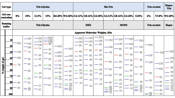 6. 預(yù)染蛋白在不同的緩沖體系中顯示的表觀分子量可能有所不同。為了大致確定蛋白的分子量,建議在該緩沖體系中先用非預(yù)染蛋白進(jìn)行標(biāo)定。您也可以參考我們提供的標(biāo)定數(shù)據(jù),以大致了解不同分子量的蛋白 Marker 在不同緩沖液中的表現(xiàn)(見(jiàn)下表)。